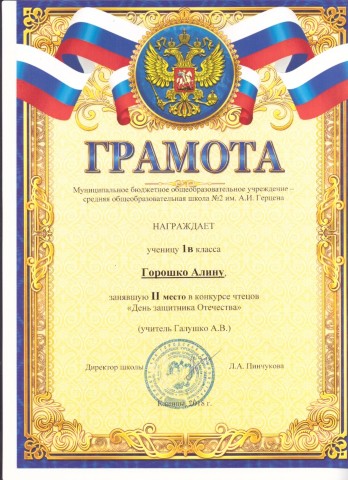 Горошко Алина - з место в конкурсе чтецов "День защитника Отечества" |